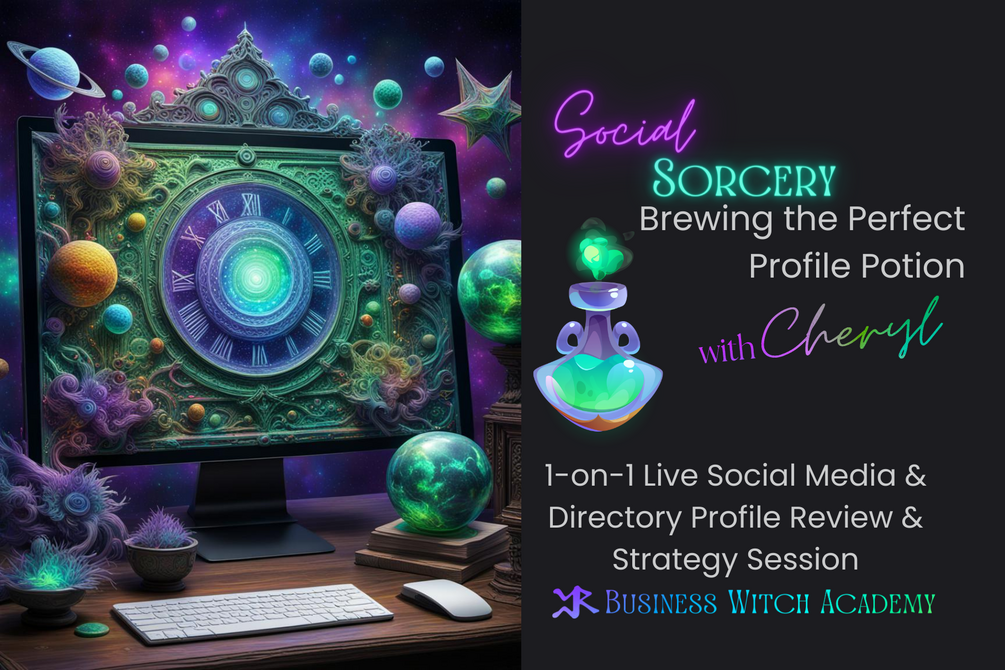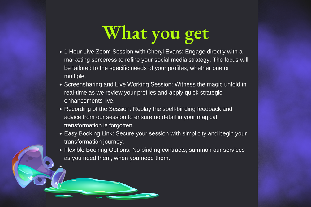 - 90 Minute Live Zoom Session with Cheryl Evans: Engage directly with a marketing sorceress to refine your social media strategy. The focus will be tailored to the specific needs of your profiles, whether one or multiple.